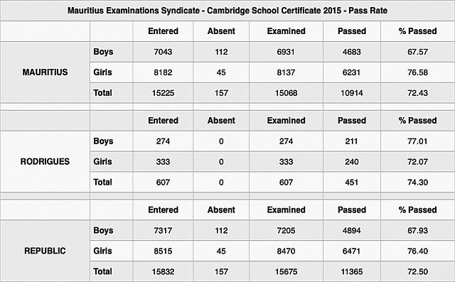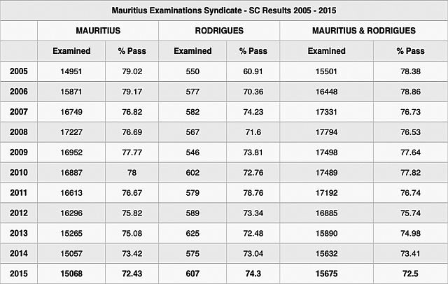 In a press conference on the same day, the Mauritius Examination Syndicate (MES) revealed that the pass rate for the SC for year 2015 is of 72,5%. However, a decline was noted compared to 2014 where the pass rate was of 73,4% – that is a decline of 0,91%. In addition to this, performance in core subjects like English has also dropped.