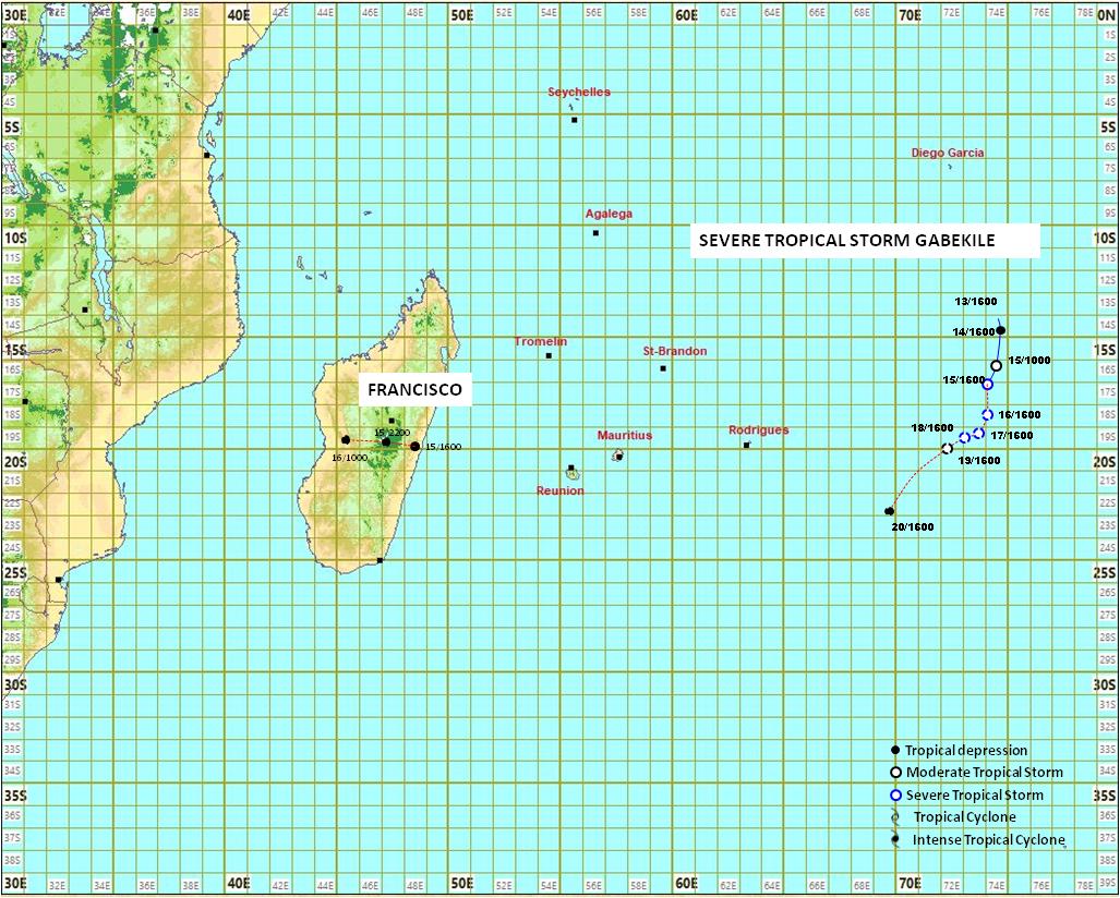 La tempête tropicale modérée Gabekilé s'est intensifiée en une forte tempête tropicale. « A 16 heures, cet après-midi, Gabekilé était centrée autour du point 17,1 degrés sud en latitude et 74,1 degrés est en longitude, soit à environ 1 745 km à l'est-nord-est de Maurice », indique le service météo.