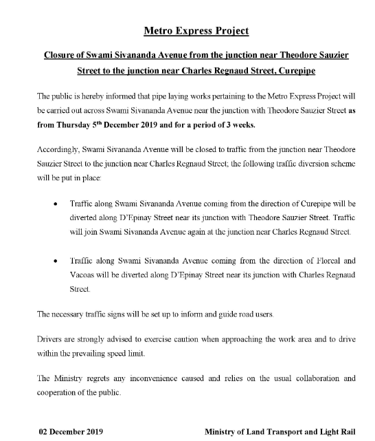 Toujours à Curepipe, cette fois à la jonction de l'avenue Swami Sivananda et rue Theodore Sauzier, des travaux seront en cours à partir du 5 décembre pour une période de 3 semaines. Cette partie de la route sera alors fermée. Des déviations seront également prévues dans cette région.