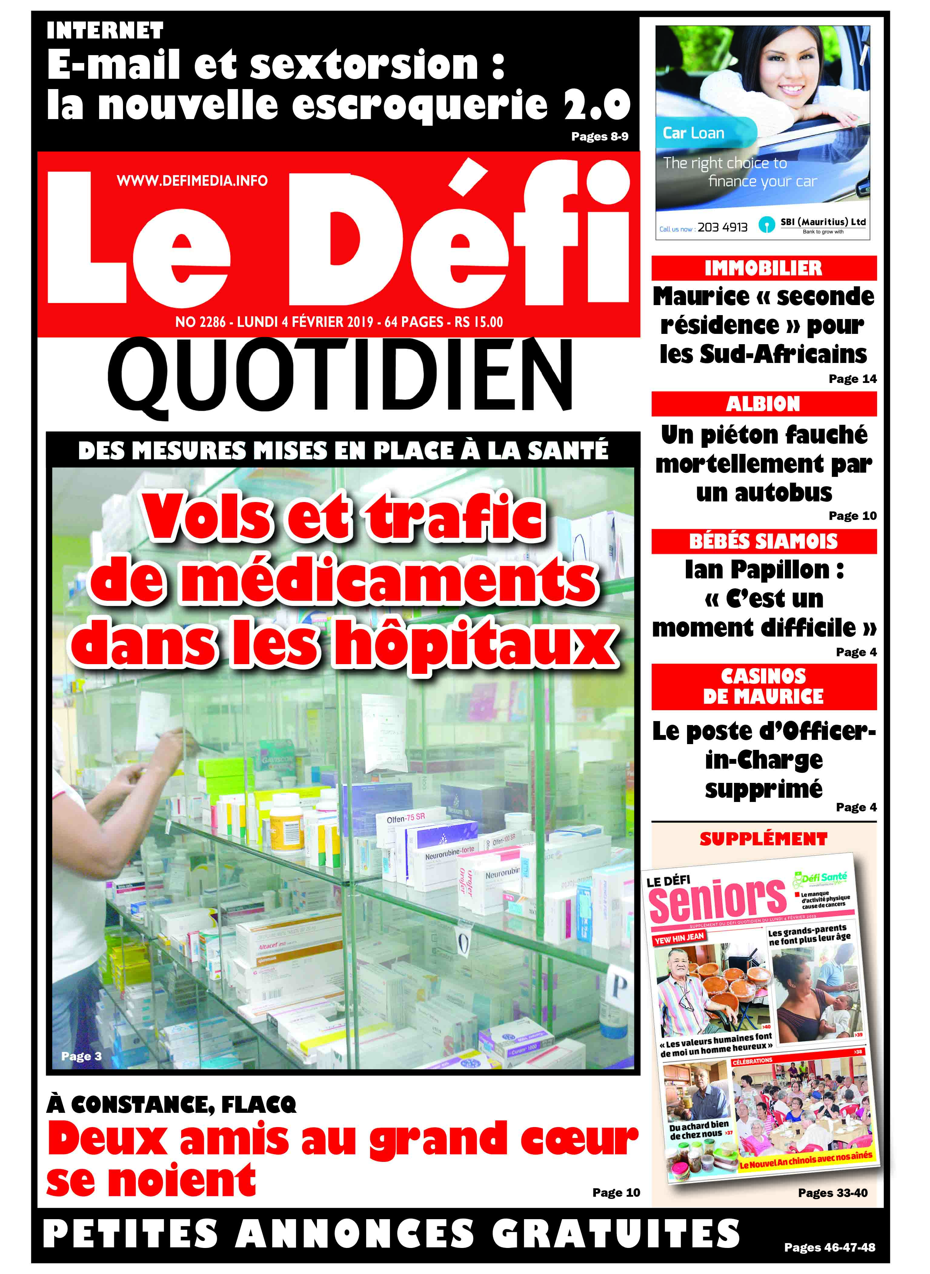 Voici la Une du Defi Quotidien de ce lundi 04 février 2019