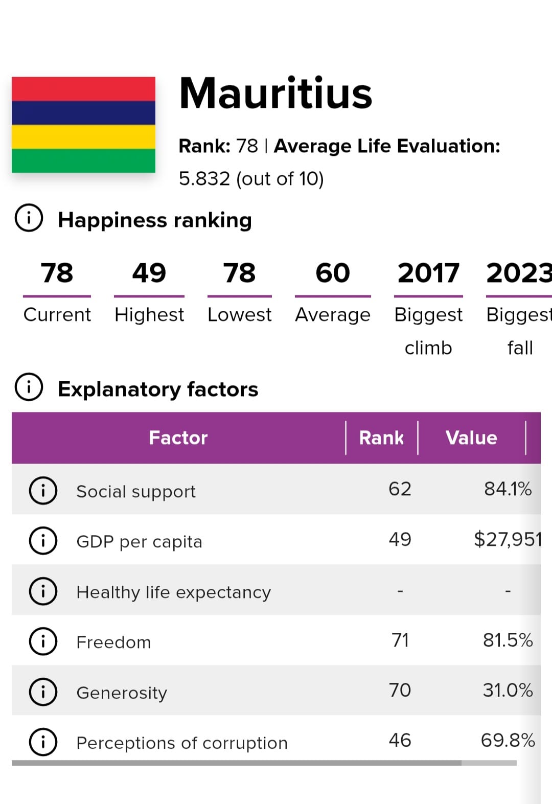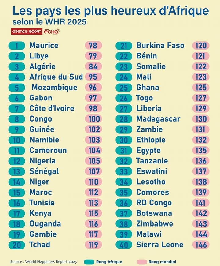 Le World Happiness Report 2025 place Maurice en tête des pays africains et à la 78ᵉ place au niveau mondial. Ce classement repose sur plusieurs critères, notamment la liberté individuelle, la générosité, la perception de la corruption et le revenu par habitant.